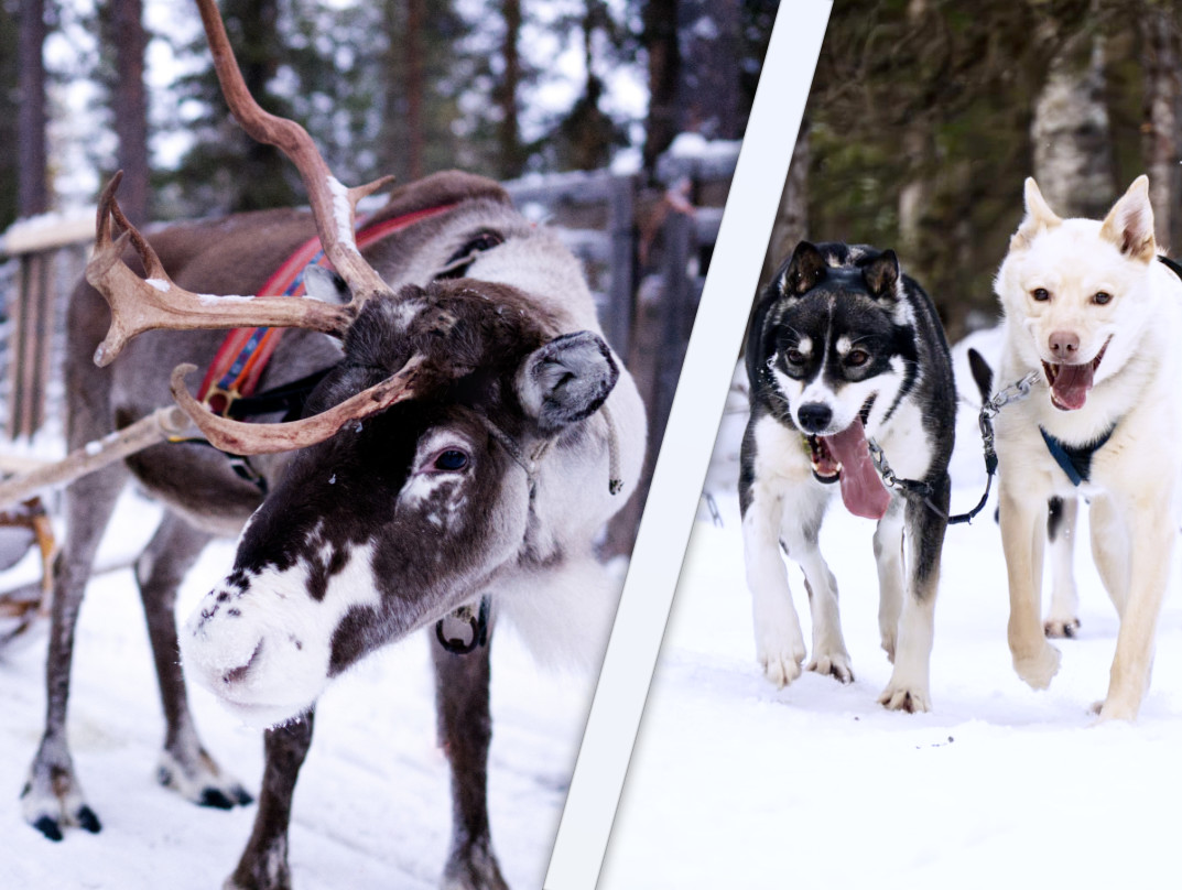 Step into a true Arctic fairytale, where gentle reindeer and spirited huskies take you on an unforgettable journey through Lapland’s snowy wilderness. This magical adventure combines the serenity of a 0.6km reindeer sleigh ride with the thrill of a 1.5km husky safari, connected by an exhilarating snowmobile-towed sleigh ride through the enchanted forest.