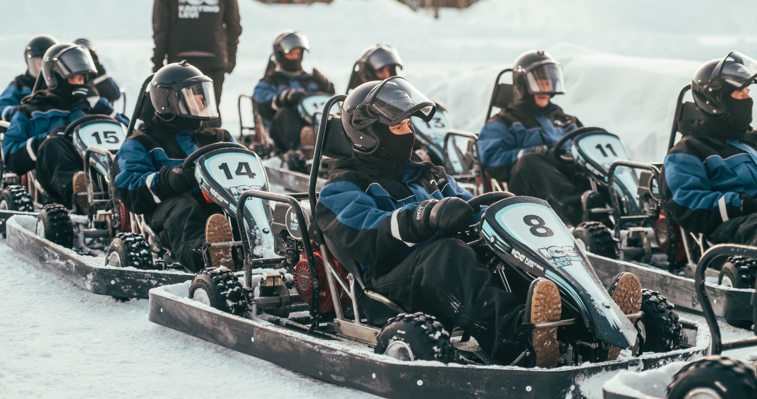The quests are supplied with complete winter-racing gear, including helmets, balaclava, shoes, gloves and overalls.